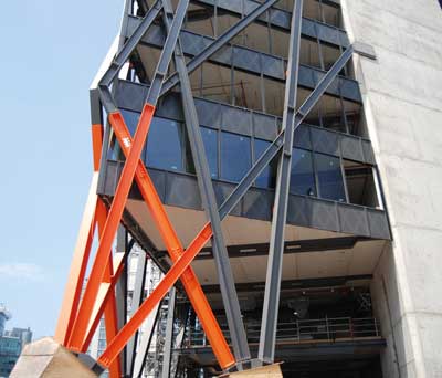The exoskeleton of the Brunel Building is an architectural feature which supports vertical loads but does not resist lateral loads, thus not fully exploiting the available structure. The lateral stability of the building is provided by three substantial concrete cores. The absence of stiffeners in the connection details between the less-steeply inclined elements and the steeper ones in the exposed frame confirms that the forces in the former elements are not significant.