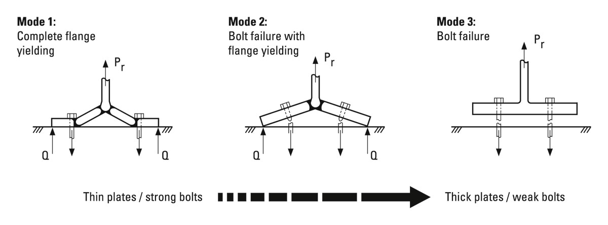 Figure 2 is taken from SCI-P- 207 and shows the 3 possible failure modes that may occur in a bolted end plate moment connection. The traditional British approach (Section 2.5, SCI-P- 207) to achieving steelwork connections that are designed to be fully rigid up to ultimate limit state is to ensure that Mode 3 is the critical mode of failure for the connection. In simple terms, mode 3 is bolt failure and is usually achieved by making the end plate thickness not less than the bolt diameter on the beam side.
