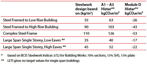 EPD GWP figures can be put into context with the 2020 LETI embodied target of 600 kgCO2e/m² for offices with some basic estimations. Using Histar® rolled sections and estimated quantities from the recent BCSA costing update with BCIS Steelwork indices for building works material frame make-up gives the table below.