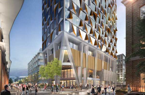 The lower parts of the building will feature a series of V-shaped raking columns supporting a third-floor podium deck. The structure will also have an eye-catching faceted façade of perforated metal cladding.