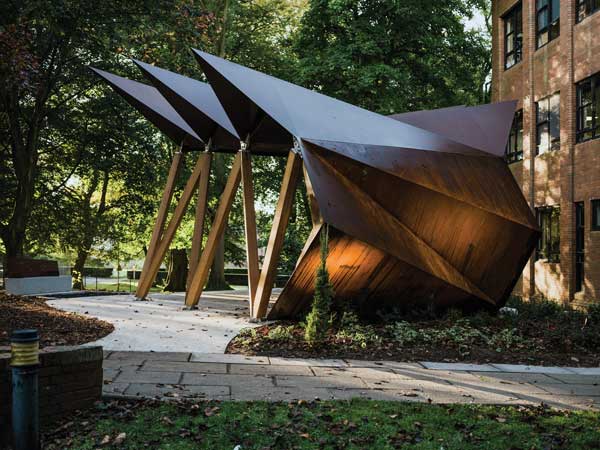 Summing up, the judges say: imaginatively conceived, with full involvement of the school and its leadership, and thoughtfully delivered, this deceptively simple canopy exemplifies the remarkable potential of weathering steel no matter the scale. The clearly legible folded plate structure creates an elegant form which maximises the pedagogical value of the project and provides a new focal point on the campus. ■