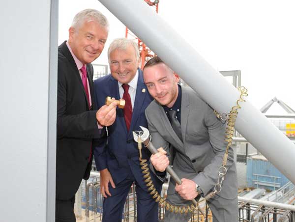 The milestone was marked when trainee sub-contractor Matt Alcock inserted a golden bolt into a steel girder at the highest point of the building – by M&G Real Estate, the property investment arm of Prudential and development partner Ballymore.