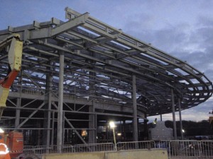 Again a large open area within the centre of this part of the structure has been formed with a series of 13 trusses. To take into account the SRC’s D-shape and the curvature in the roof, each truss has been individually fabricated. They are all approximately 30t in weight, but vary in depth and length, with the longest truss being 30m-long.
