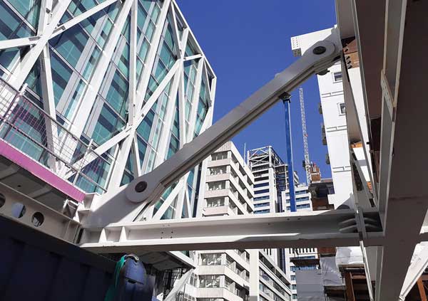 The steel transfer structure also includes four secondary trusses, which measure 12.5m-long × 5.2m-deep. Weighing up to 18t each, these trusses were fabricated and delivered to site as complete sections.
