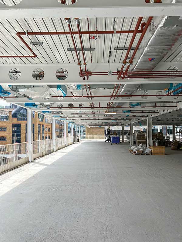 The steel frame starts at ground floor slab and all of the upper levels are formed with cellular beams, supporting metal decking and a concrete topping to form a composite flooring solution.