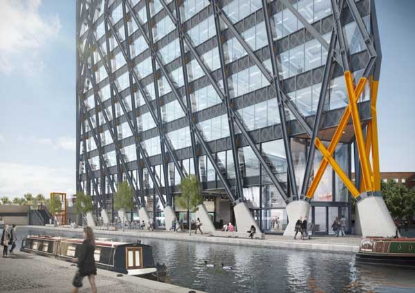 The new steel-framed diagrid Brunel Building will comprise 22,300m² of offices fronting the Grand Union Canal opposite Paddington station.