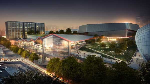 The development includes a 12,500-capacity arena; 6,300m² of conference and exhibition space; two hotels, bars, restaurants, car parking and extensive areas of public realm.