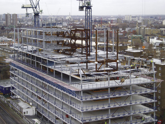 Buildability has been a primary concern on the project, given that the site is bounded by roads, the main railway line from Charing Cross and the Jubilee Line underground. “Because of the railway, roads and tube, the building is designed around understanding the contractor’s problems,” says Mr Brown. Any crane lift of more than 8.5 tonnes is deemed a ‘controlled lift’ requiring special supervision by Network Rail personnel, so the building is designed to be constructed without exceeding this limit.