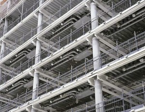 A great deal of innovative thought has gone into the composite columns and their connections with the floor beams. Composite construction, using circular hollow section columns filled with concrete, is efficient both structurally and from a fire resistance point of view. The concrete acts as a heat sink to conduct heat away from the fire. Because the concrete is confined within the steel tube, it cannot fail by bursting (which is why this approach is used in design to resist earthquakes). The overall column size is kept compact and no external fire protection is needed.