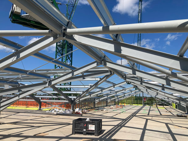 Both of the two-storey concrete-framed units feature multiple long-span pitched roofs, which are being created with steel columns and beams.