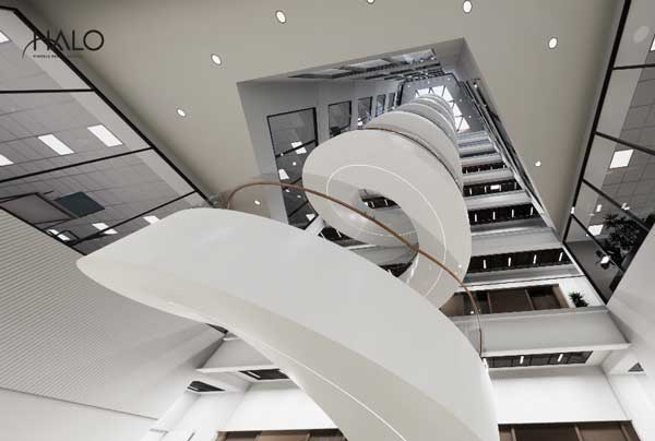 Rising from Halo’s ground floor, the cantilever stair will be fabricated into transportable elements by Taunton Fabrications. The 90t structure is due to be installed during summer 2021.