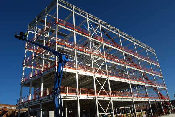 Working in tandem with the diaphragm action of the composite floors, the steel frame gains its stability from bracing.