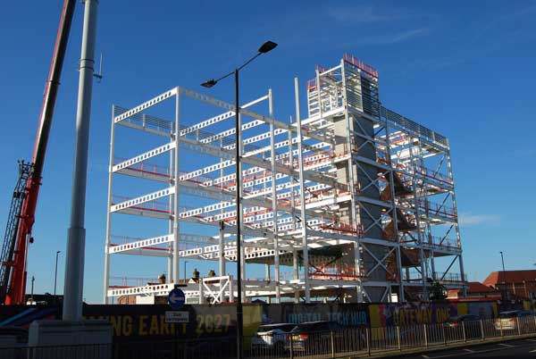 Supported on the piles, the steel framed structure starts at ground-level and incorporates a braced core, which is positioned along the Trafford Way elevation (facing away from the station) and accommodates precast stairs and a precast lift shaft.