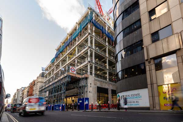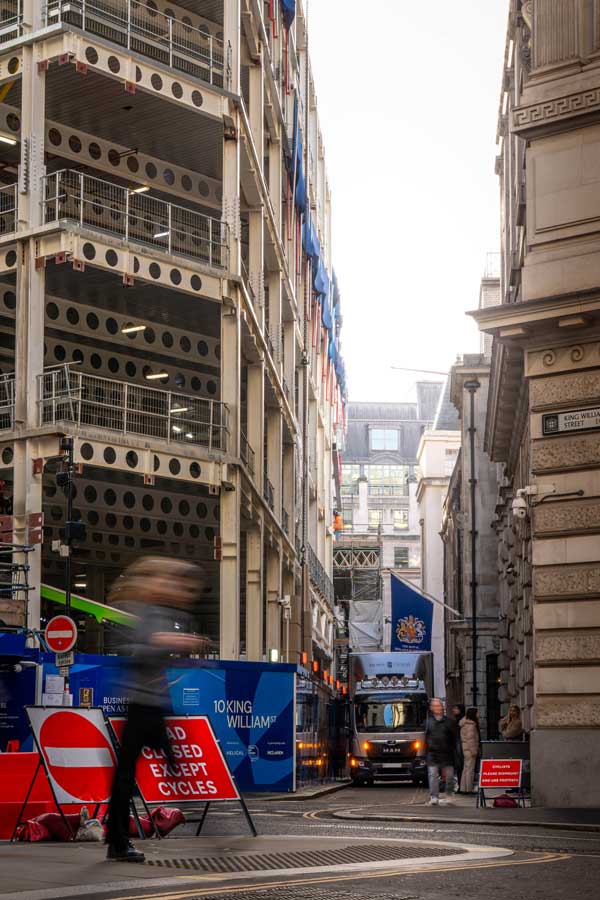 Working in central London, space is always at a premium and this project has been fortunate to have gained permission to close one side of King William Street, for its invaluable delivery pit lane.