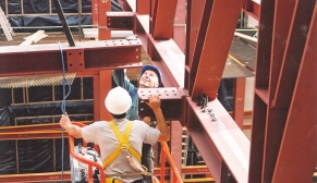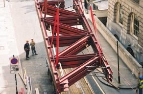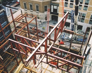 The sequence of works on site, critical to the success of the project, was carefully planned to avoid the need for additional temporary works. Carefully sequenced removal of mullions brought about a controlled change in the load path of the perimeter structure. By placing the new steel frames inboard of the existing mullions, they could be installed on a floor-by-floor basis before demolition of the mullions began. Disproportionate collapse and local bearing stresses between floors were assessed in detail, and overcome by the use of continuous ties and spigot blocks in the connections.