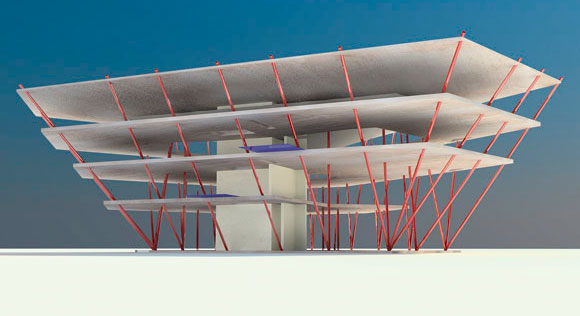 To form this unusual structure, along with its extreme sloping façades, a series of raking steel columns have been installed around the building’s perimeter. The columns help form the cantilevers on each floor level, while a central concrete core provides the structure’s stability.