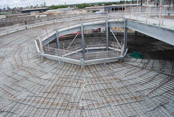 A series of cranked beams, connected by cross members create the helical ramp’s roadway, which is then completed with metal decking and a concrete topping.