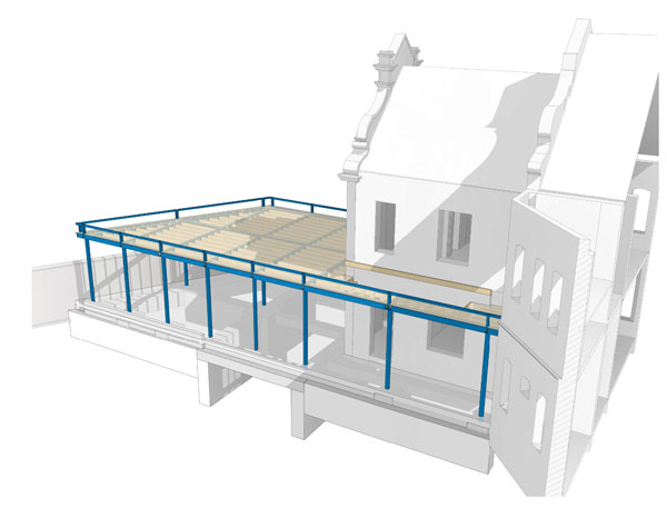 Complementing the Town Hall renovation work, an 11.9m-long × 8m-wide steel-framed extension has been erected along the building’s southern elevation.