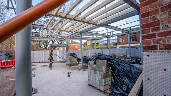 A central element of Earlestown’s redevelopment plans is the restoration of its Grade II listed Town Hall and the addition of a steel-framed café extension.