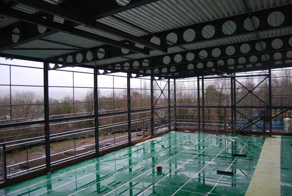The roof of the pool hall and sports hall are both formed with a series of 20m-long cellular beams which were brought to site in two pieces and spliced together on the ground before being lifted into place using the erection team’s 90t-capacity mobile crane.