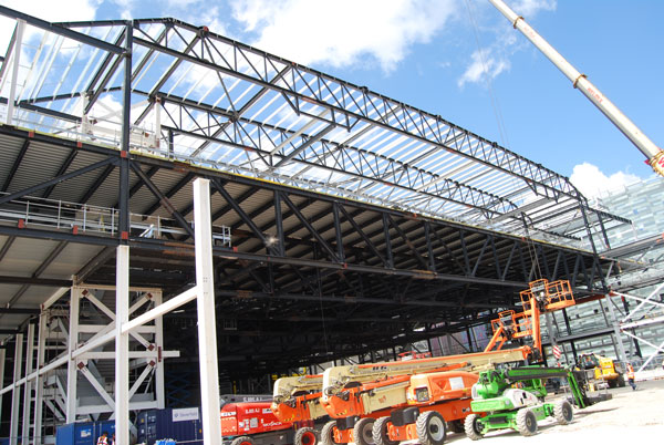 Topping the extension is a further series of 50m-long roof trusses, which are also delivered to site in four sections.