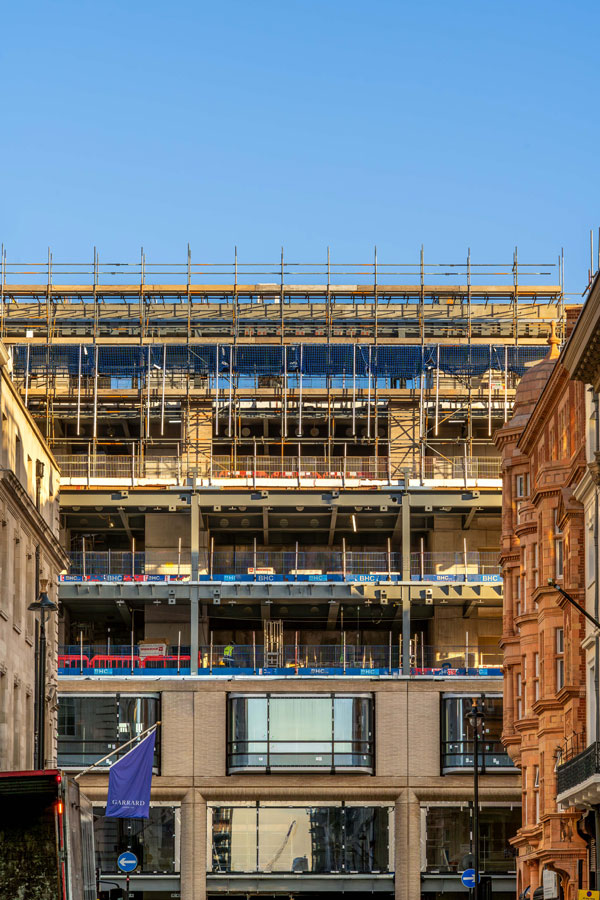 Like many inner-city construction sites, this project has had to work around a number of constraints. Aside from the narrow and busy surrounding streets, the southbound Victoria Underground line and the culvert for the Tyburn River run directly beneath the site, a major sewer is under the New Bond Street pavement, and to the north, the new building abuts an historic party wall. Monitoring of all these assets has been ongoing throughout the construction programme.