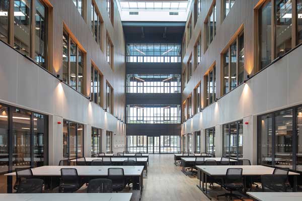 The design of the five-storey building creates four separate teaching zones, divided by full-height atriums, feature stairs and central open-plan collaboration spaces.