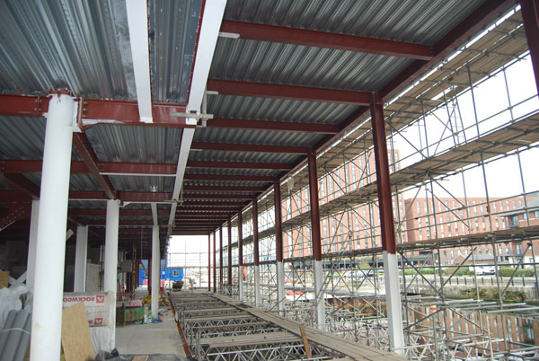 Framing both sides of the colonnade are a series of CHS columns, chosen for their aesthetic appearance as these members are the only parts of the building’s steel frame to be left exposed in the completed scheme.