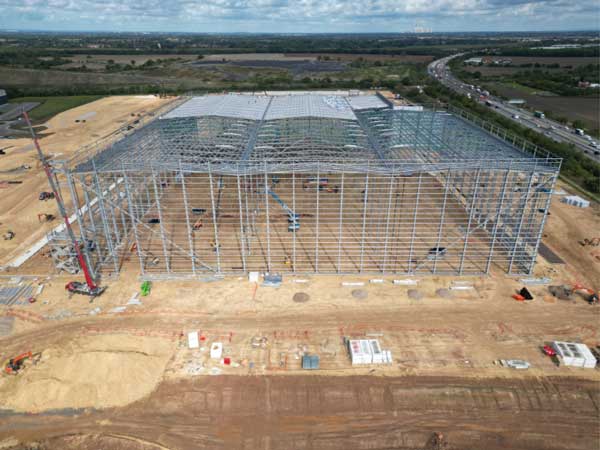 Work is now progressing on the 28m-tall low bay part of the 252,500m2 automated facility, which requires a total of 6,000t of steelwork.