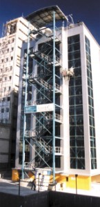 The structural columns and the guide columns of the elevators have a tolerance of 10mm between 0 and 45m. The frame rails of the moving platforms which carry the cars have a tolerance of +/- 1mm. The guide columns for elevators have a tolerance of +/- 3 mm. In the vertical direction, there is a tolerance +/- 1.5 mm. Each 150 ton module was erected in 20 days using high strength bolted connections.