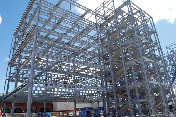 With no internal columns, the clear spans are up to 12m-long. As well as providing the required open-plan flexible office floorplates, the cellular beams accommodate the building’s services within their depth and support the metal decked and concrete topped composite flooring solution.