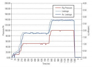 The test cell has been designed to enable sections of cladding system such as wall panels, corners, roof ridges, gables, and eaves to be mounted on top of a perfectly sealed open top box. Air is then pumped into the box to achieve a predetermined pressure, commonly 50 pascals as this is the prescribed test pressure for buildings, and the resulting airflow rate measured to indicate leakage. Leakage rates can be assessed for a range of pressures to give a leakage characteristic for the cladding details under test. Typical results are shown in the graph.