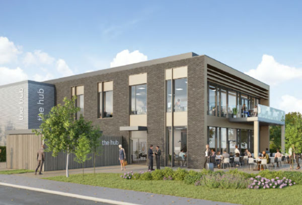 The hub building is designed as a mixing area for the whole site, with the ground floor including a cafe/seating, gym and cycle provision and the first floor accommodating flexible work spaces. The building would be sited within a landscaped area with outside seating.