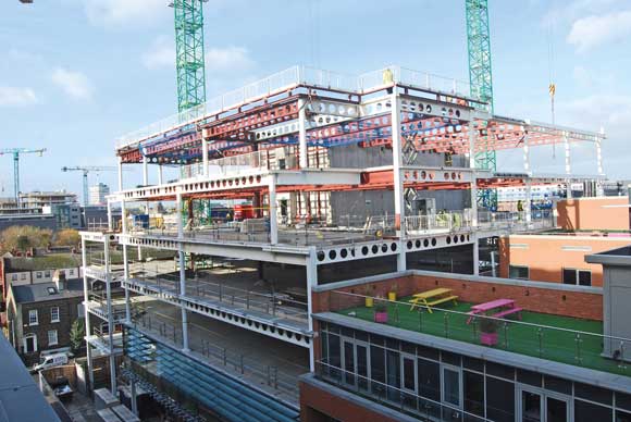 Cellular beams, measuring 740mm-deep and with 500mm holes, have been used throughout the project for a cost-effective method of accommodating the building’s services. The beams support a composite metal deck flooring solution throughout.