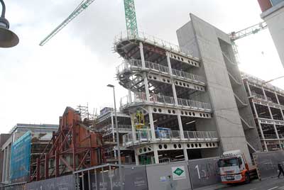Occupying a slither of land between the retained pub building and an existing structure, number 6 has been knocked down and is being rebuilt as a stepped four-storey steel-framed building that will link into the main building.