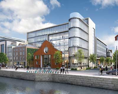 Overlooking the River Liffey, Dublin’s latest prestigious commercial scheme is a highly-engineered steel-framed project incorporating two historic structures. Martin Cooper reports.