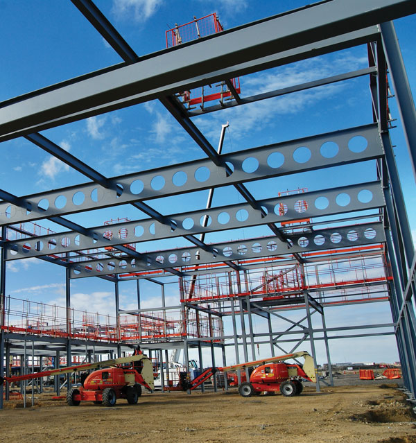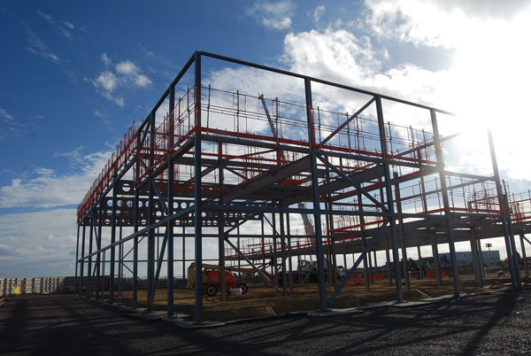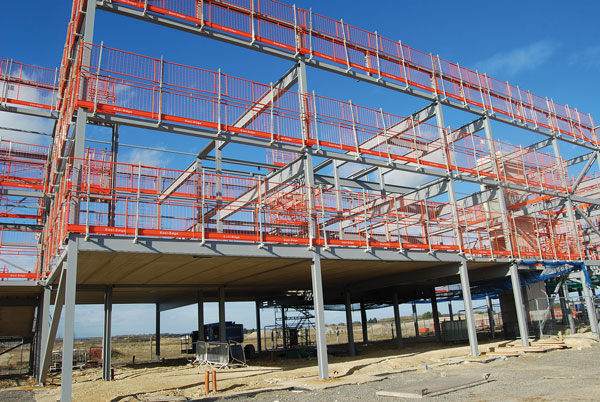 Using its own mobile cranes, AC Bacon erected the steel frame of the main block in four phases. Once each phase was complete, the area was handed over to the concrete contractor, who installed the precast planks, stairs and lift shaft.
