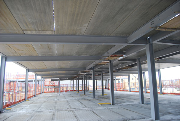 The corridors are formed with two rows of internal columns, which are connected to the perimeter steelwork via 7m-long beams.