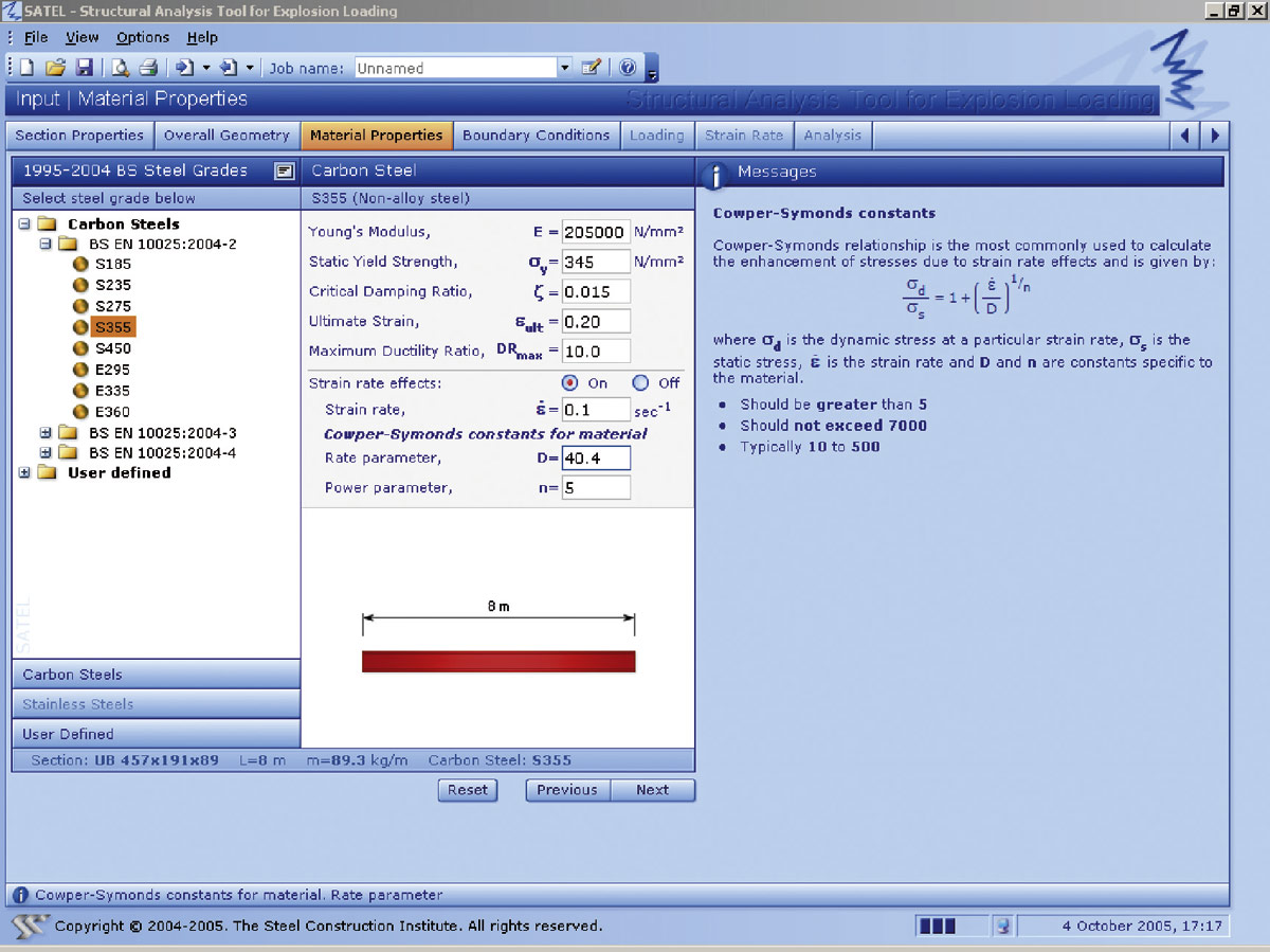 Users can also define their own material properties. Default values for the material properties are provided for materials in the SATEL database which includes most carbon steel and stainless steel grades. The material properties include Young’s modulus, yield strength, damping ratio, ultimate strain and ductility ratio. If strain rate effects are included, default values are also provided for the strain rate and the Cowper- Symonds constants for the materials in the SATEL database.