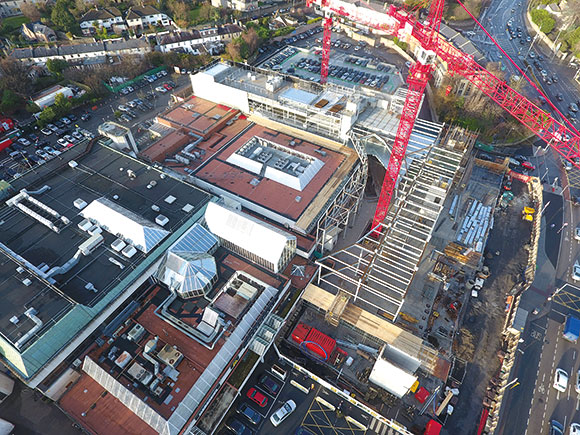 With two prominent red tower cranes on site, the extension and refurbishment of the Frascati Shopping Centre in Blackrock, County Dublin, is easy to spot above the suburban rooftops.