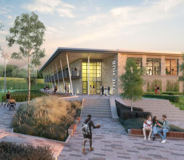 Work includes the construction of a two-storey community hub that will provide two covered netball and tennis courts, a gym and fitness suite, flexible spaces for public use, and a café with a balcony.