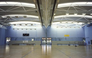 Inside the halls the exposed steel trusses have been carefully integrated into the design, with the trusses being used to define zones of translucent roof sheeting and support either tennis court netting or lighting booms.
