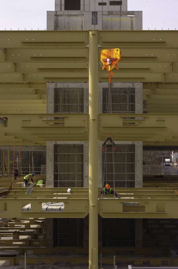 Steel erection has progressed in tandem with the installation of the precast units, and so the project is divided into phases. For each of the three phases steelwork has generally been erected up to level three, with the precast contractor following on behind.