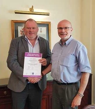 SCCS Chairman Dr. Simon Pike (right) presents Elland Steel Chairman and Managing Director Mark Denham with the certificate.