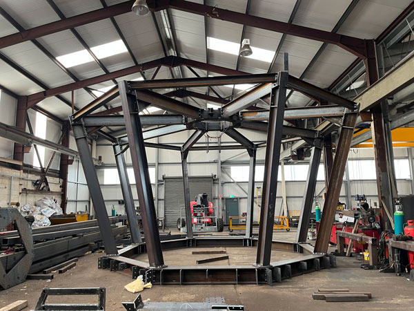 The steel frame has a ring beam that supports eight corner columns, roof beams and a central aperture.