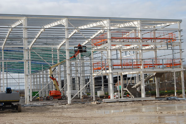 Following on from the initial warehouse, the two remaining, slightly smaller structures were erected simultaneously, using a single mobile crane for each building’s steel frame.