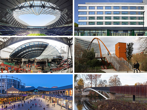 Clockwise from top left: Tottenham Hotspur Stadium, 160 Old Street, Chiswick Park Footbridge, Taplow Footbridge, Coal Drops Yard, Waterloo Station.