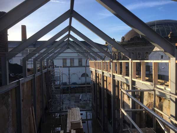 “Certain elements of the listed building had to be retained and supported, which involved tying the existing walls to the new steel frame via brackets on the steelwork and ties through the new composite metal deck floor slabs.”