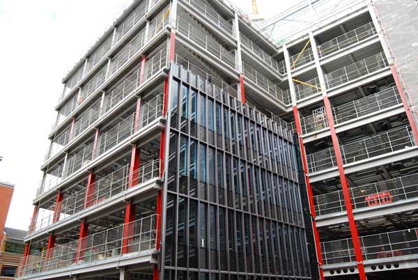 Adding some aesthetic quality to the scheme, the exposed columns are all being painted tomato red. They will be visible from the outside through the building’s extensive glazing, which is a primary feature on all of its elevations.