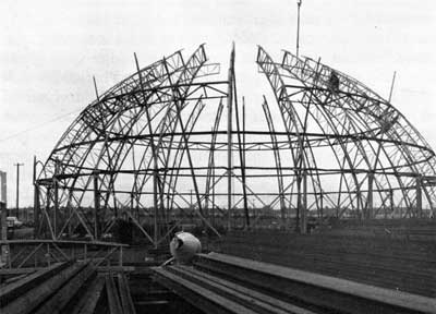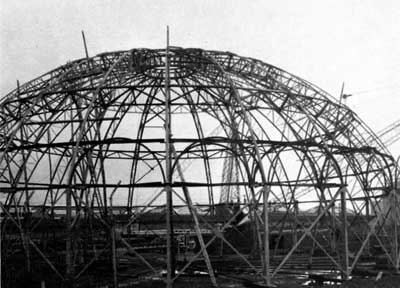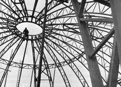 The dome was erected by progressively cantilevering the ribs inwards, as seen in this view taken during trial erection.